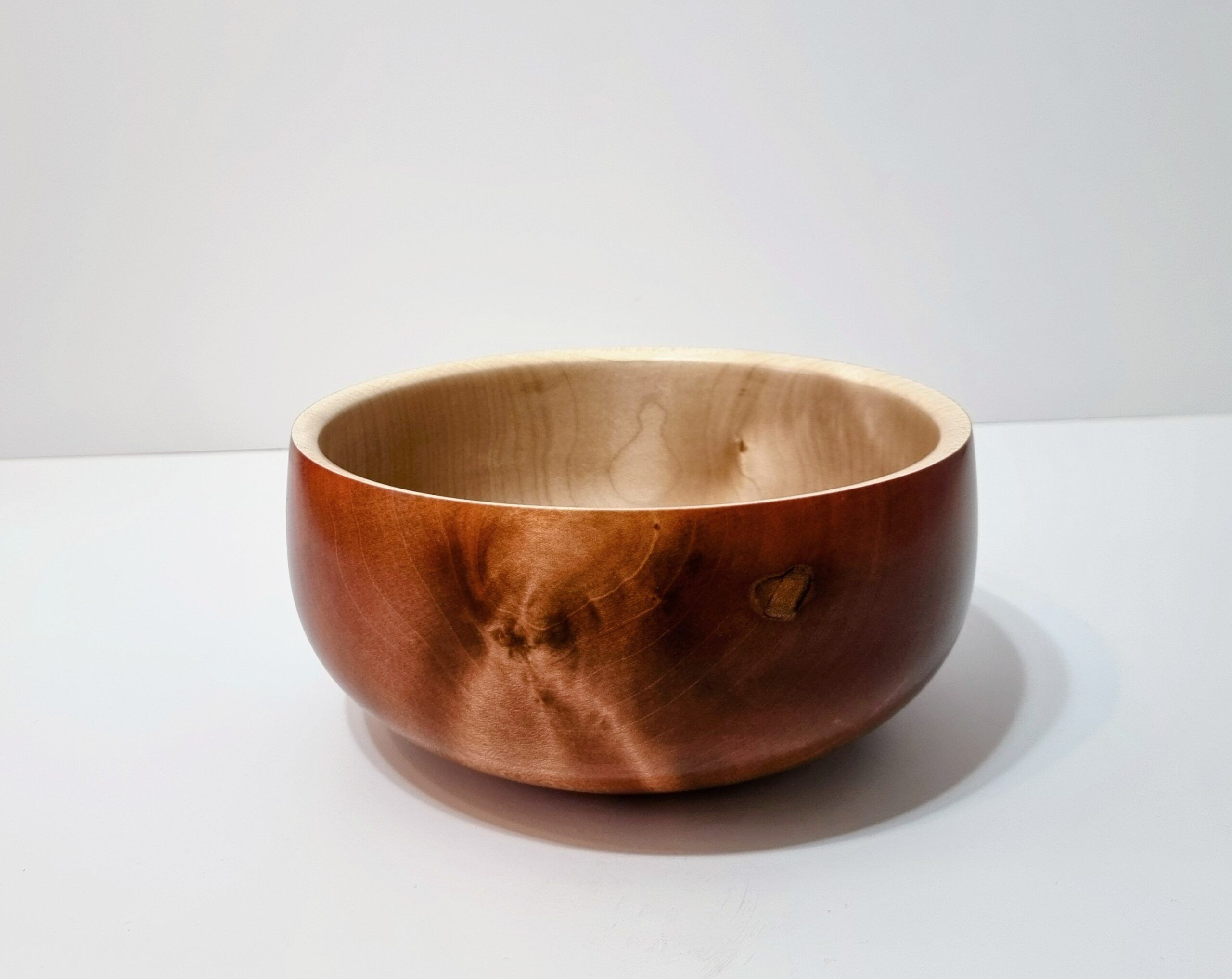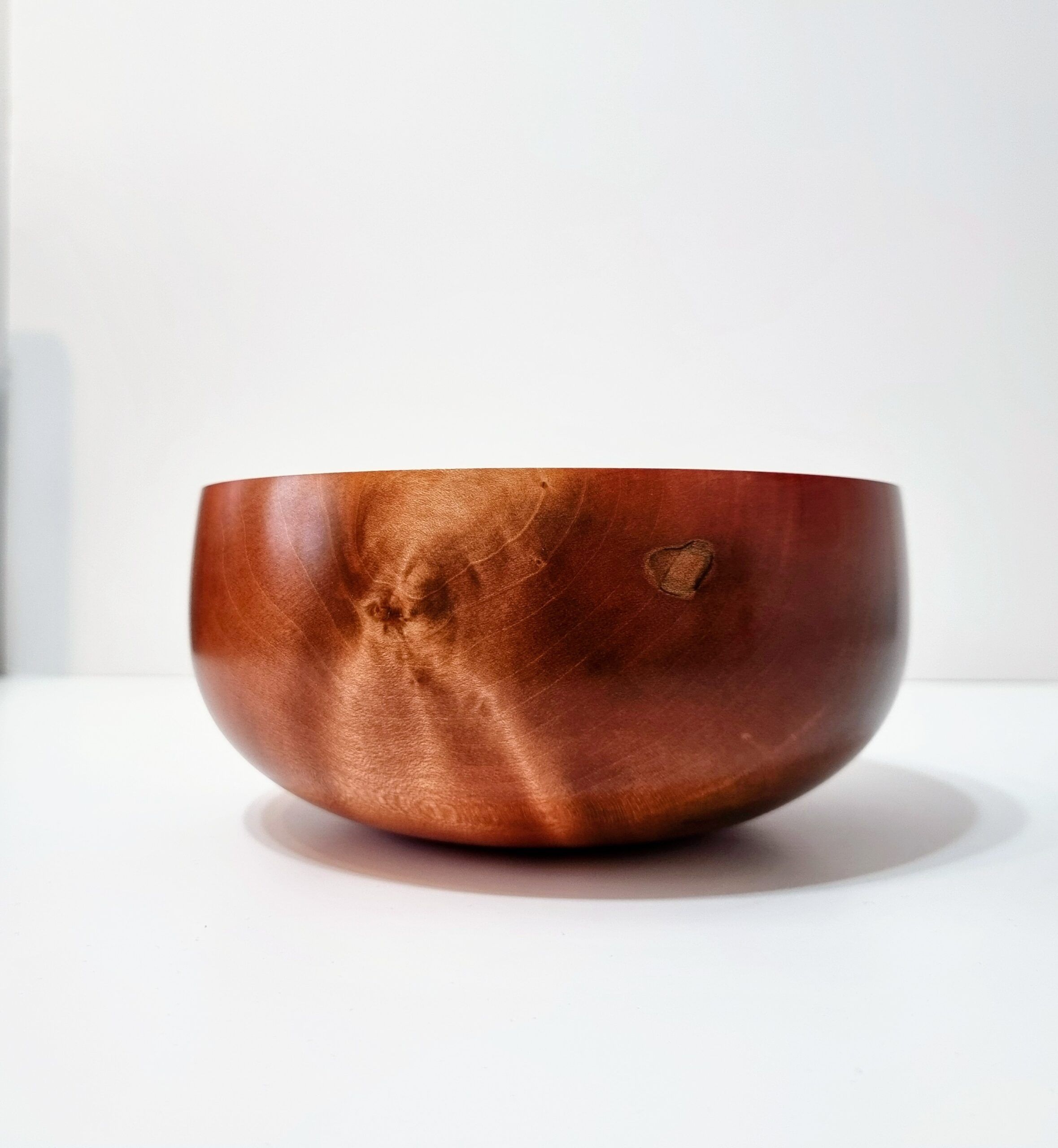 This bowl showcases the interesting grain patterns you can get in Sycamore, which makes it a great material to add a pop of colour to deepen the tone. The outside out the bowl has been stained with a variety of red pigments, helping to highlight the more distinct parts of the grain. The high gloss wax polish finish gives the piece a luxurious feel, great light reflection and adds durability.